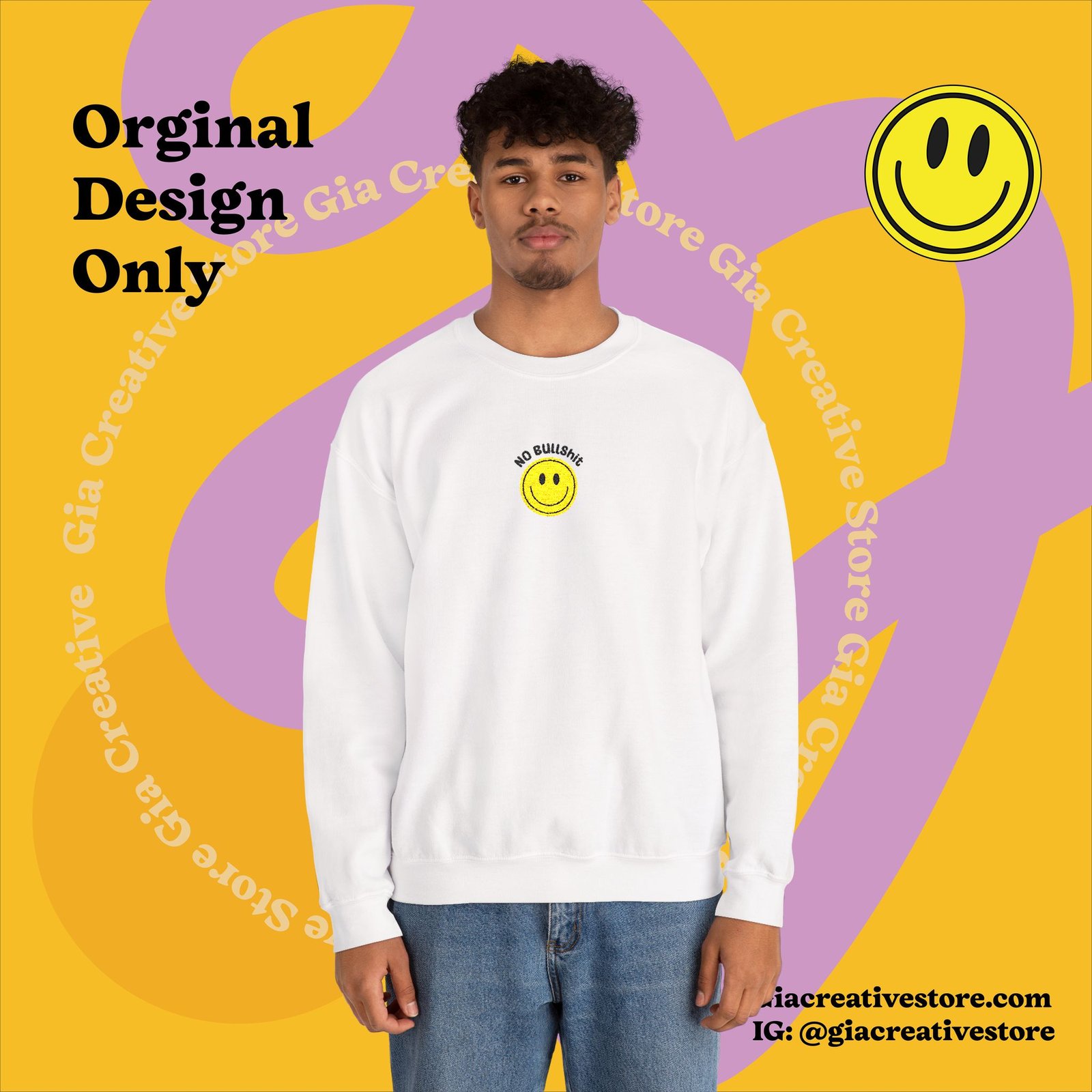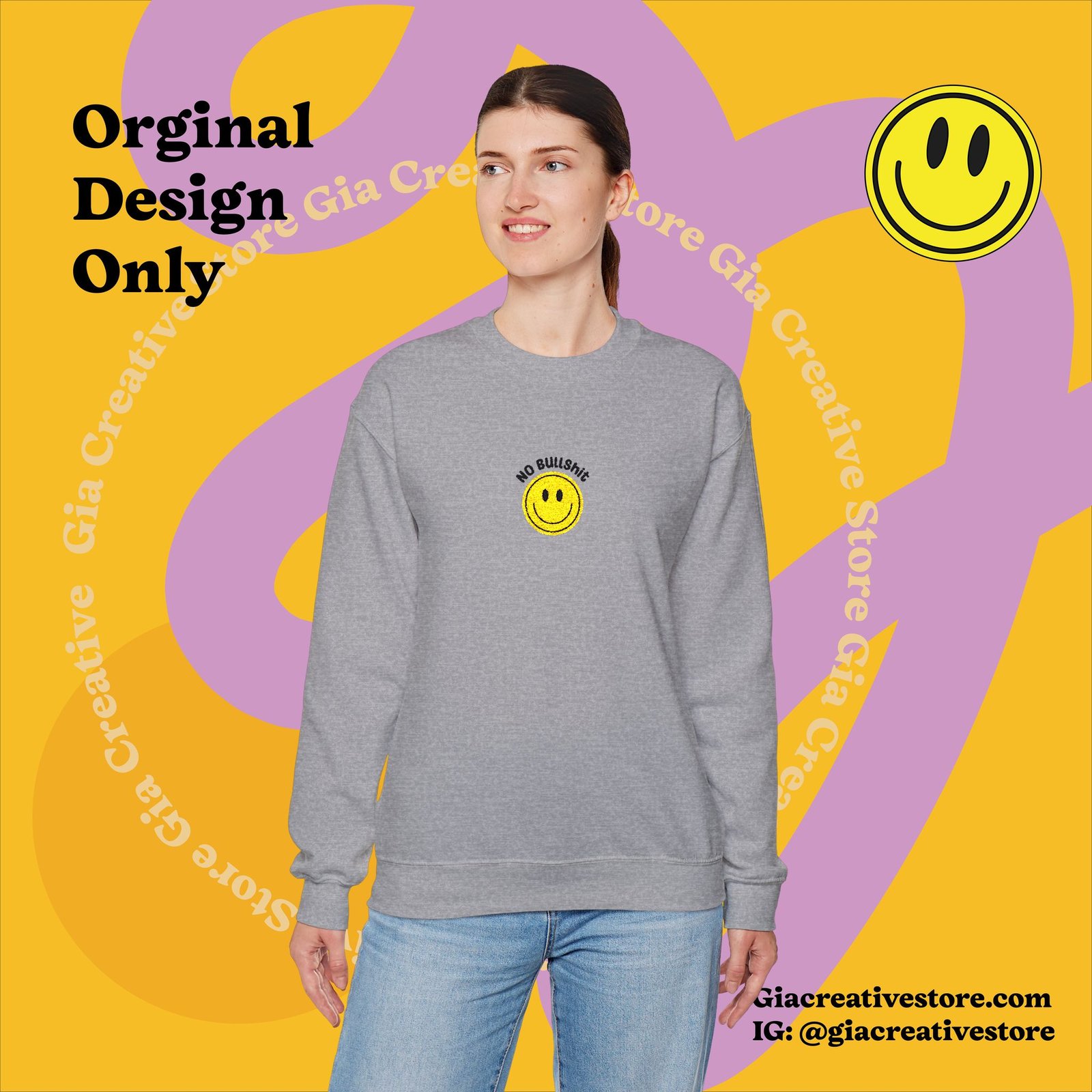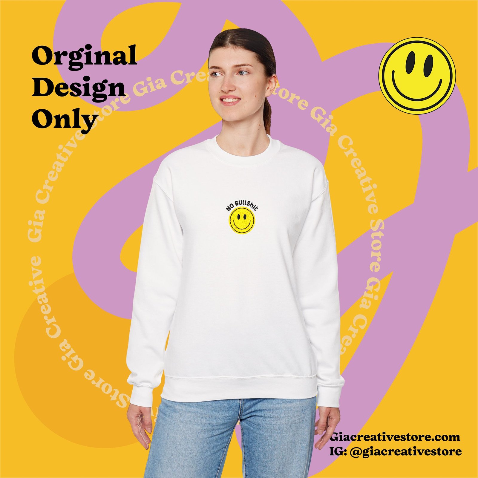 Embroidered No bullshit Cheerful Crewneck Sweatshirt with Smile Design
